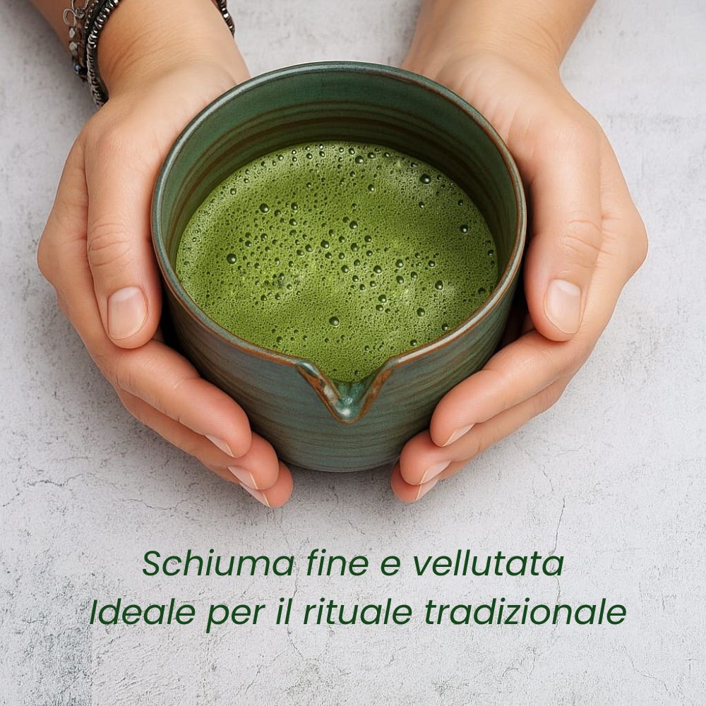 Per la preparazione tradizionale si consiglia l’utilizzo di 1–2 chashaku di matcha per porzione, da setacciare e lavorare in una chawan con acqua a circa 70–80°C, utilizzando un chasen fino a ottenere una superficie omogenea e finemente schiumata. Dopo l’uso, il chasen va risciacquato in acqua tiepida e lasciato asciugare sul chasen tate. Scopri passo passo come prepararlo.