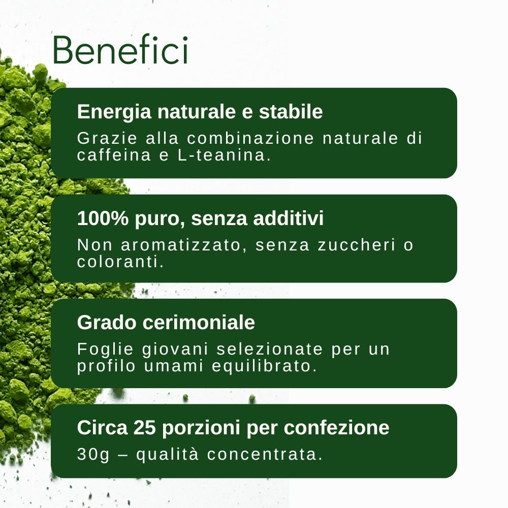 La polvere è ottenuta esclusivamente da foglie giovani e tenere, coltivate all’ombra per incrementare naturalmente il contenuto di clorofilla e L-teanina. Il risultato è un colore verde intenso e luminoso, indice di freschezza e qualità, accompagnato da una tessitura estremamente fine e setosa.